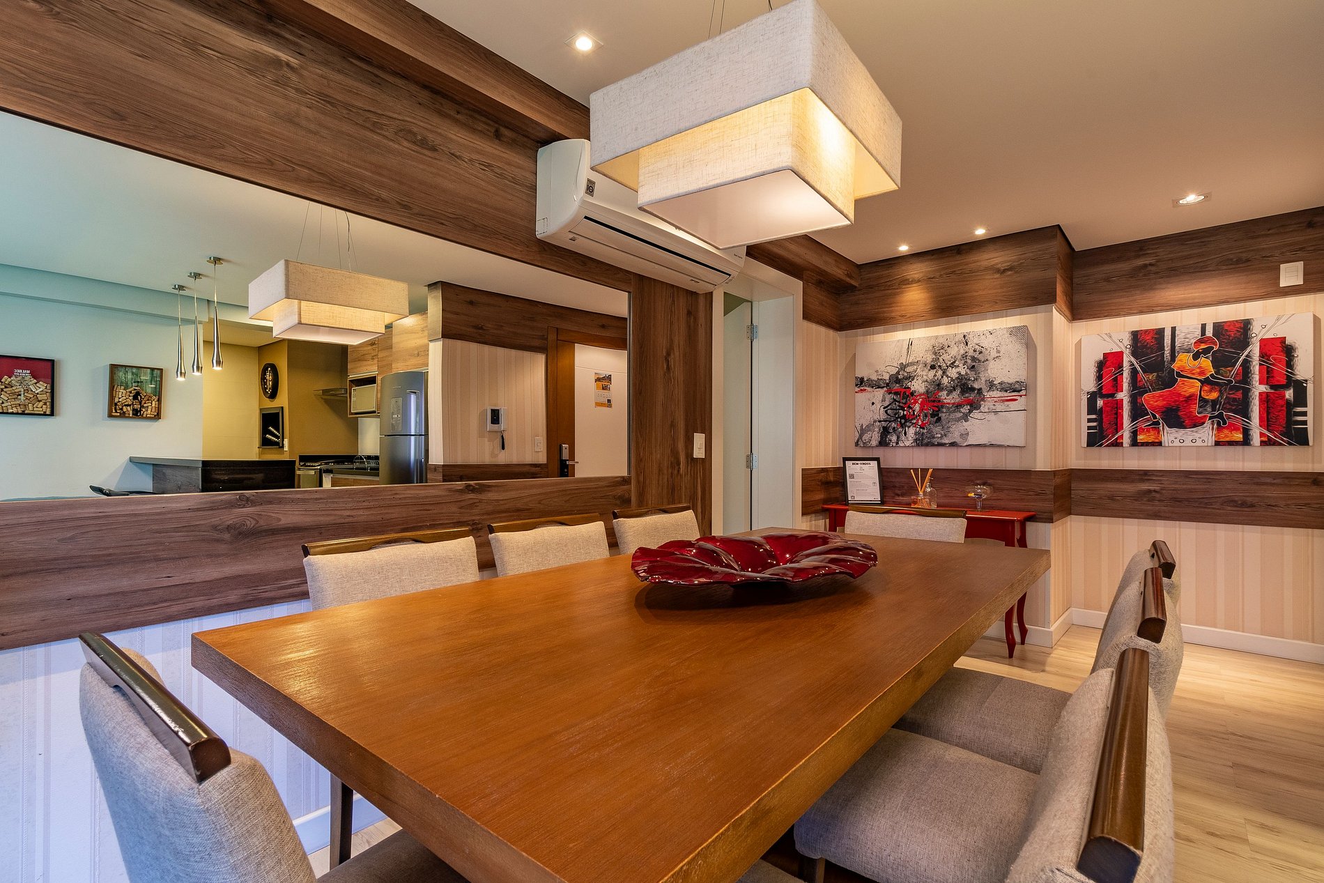 Amplo apartamento com 84m² privativos, dispondo de uma cozinha completa, mobiliada e equipada para preparar desde pequenos lanches até refeições completas. A sala de jantar é moderna, com uma mesa para 8 pessoas, e a sala de estar é espaçosa, com uma sacada integrada. O apartamento conta com dois banheiros e uma vaga de garagem coberta e segura.