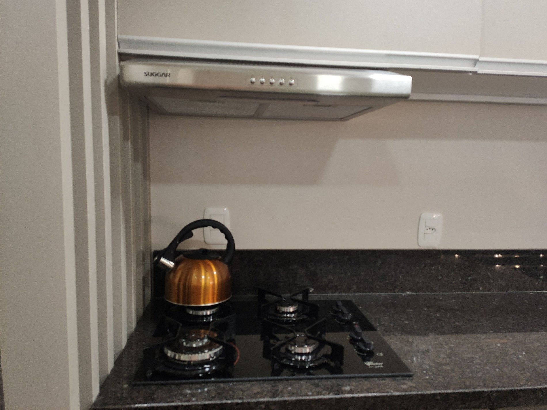 Cozinha totalmente equipada para refeições rápidas ou refeições completas. Inclui: geladeira, fogão embutido, microondas, cafeteira, sanduicheira, chaleira, todos os utensílios de cozinha (copos, facas, taças, talheres, panelas, frigideiras e etc).