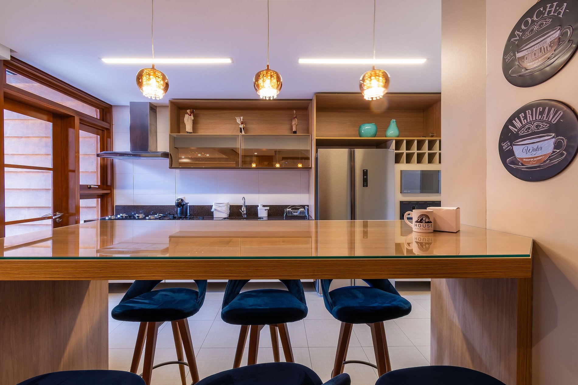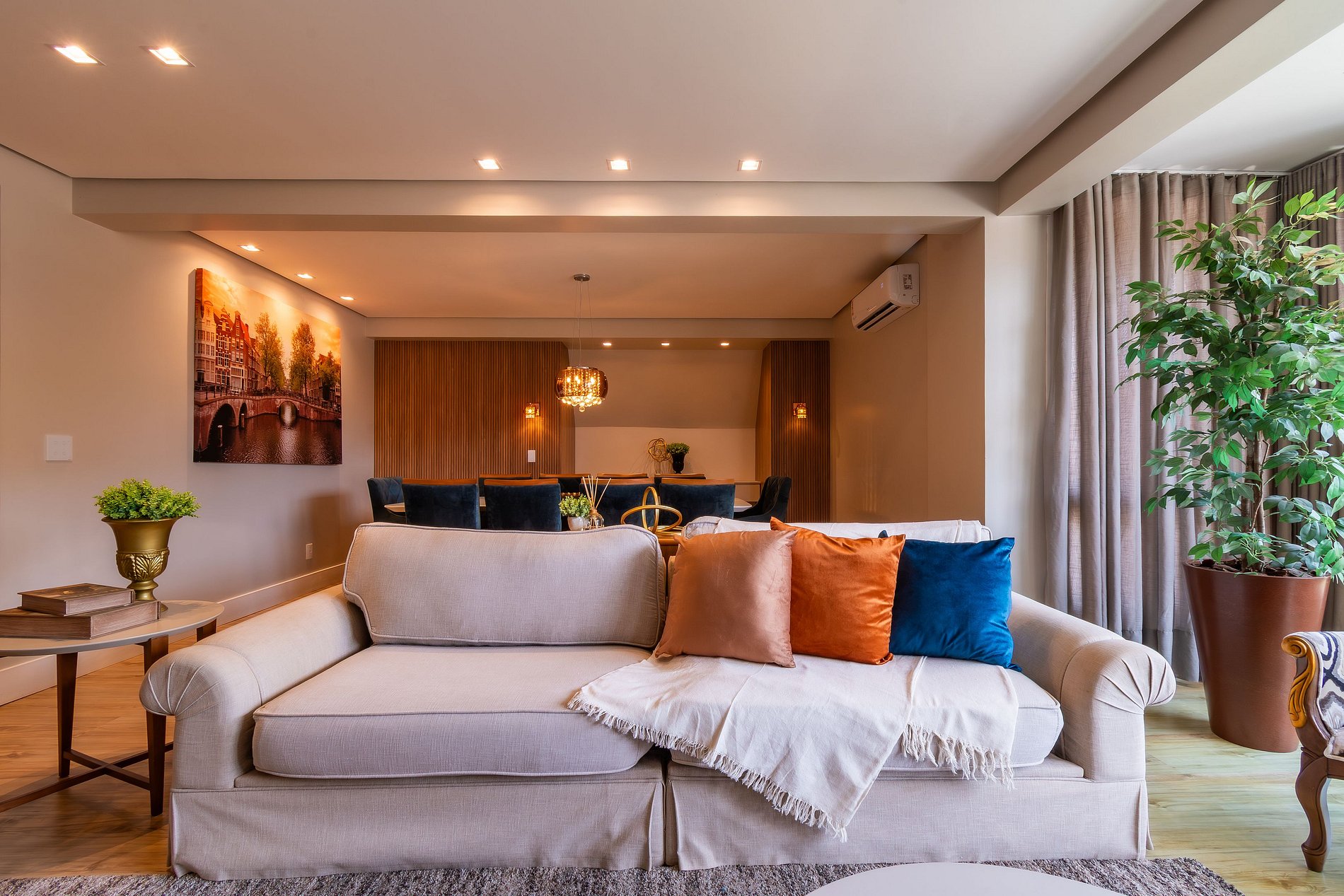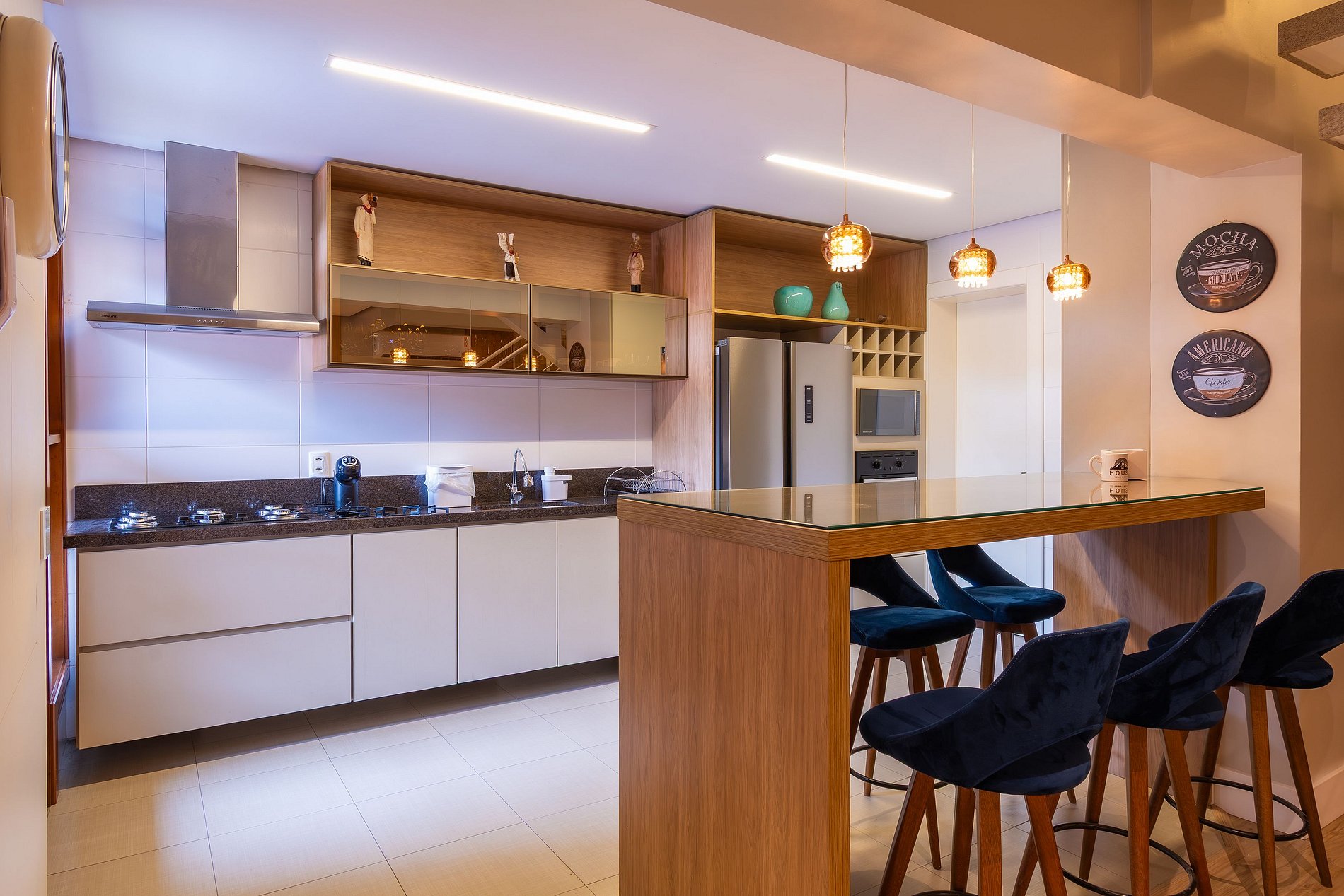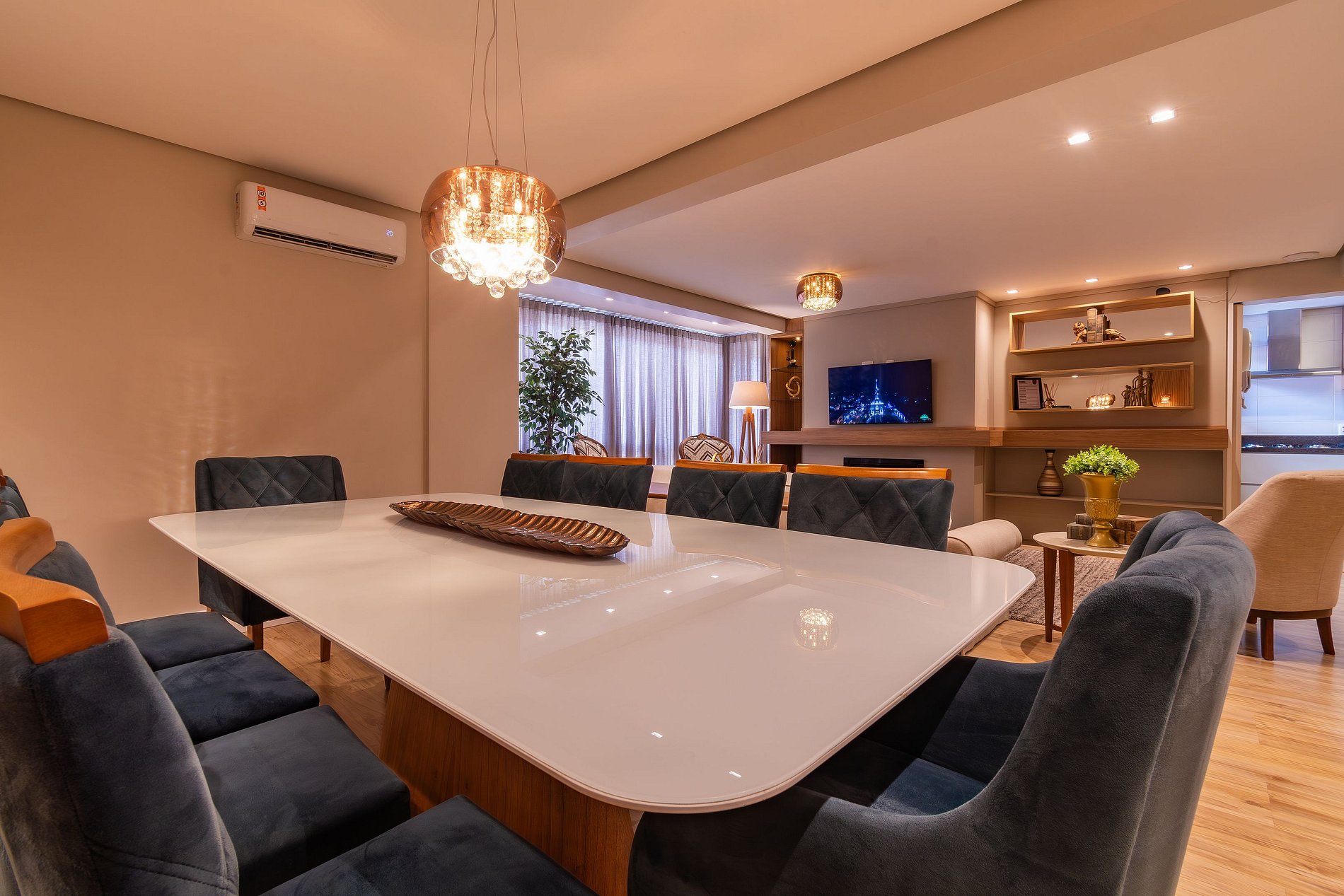 Espaçoso apartamento com 280m² privativos, oferecendo uma cozinha completa, mobiliada e equipada para preparar desde lanches a refeições completas. A sala de jantar é moderna, com mesa para 14 pessoas, e a sala de estar é ampla, com sacada integrada. O apartamento inclui quatro banheiros e duas vagas de garagem cobertas e seguras.