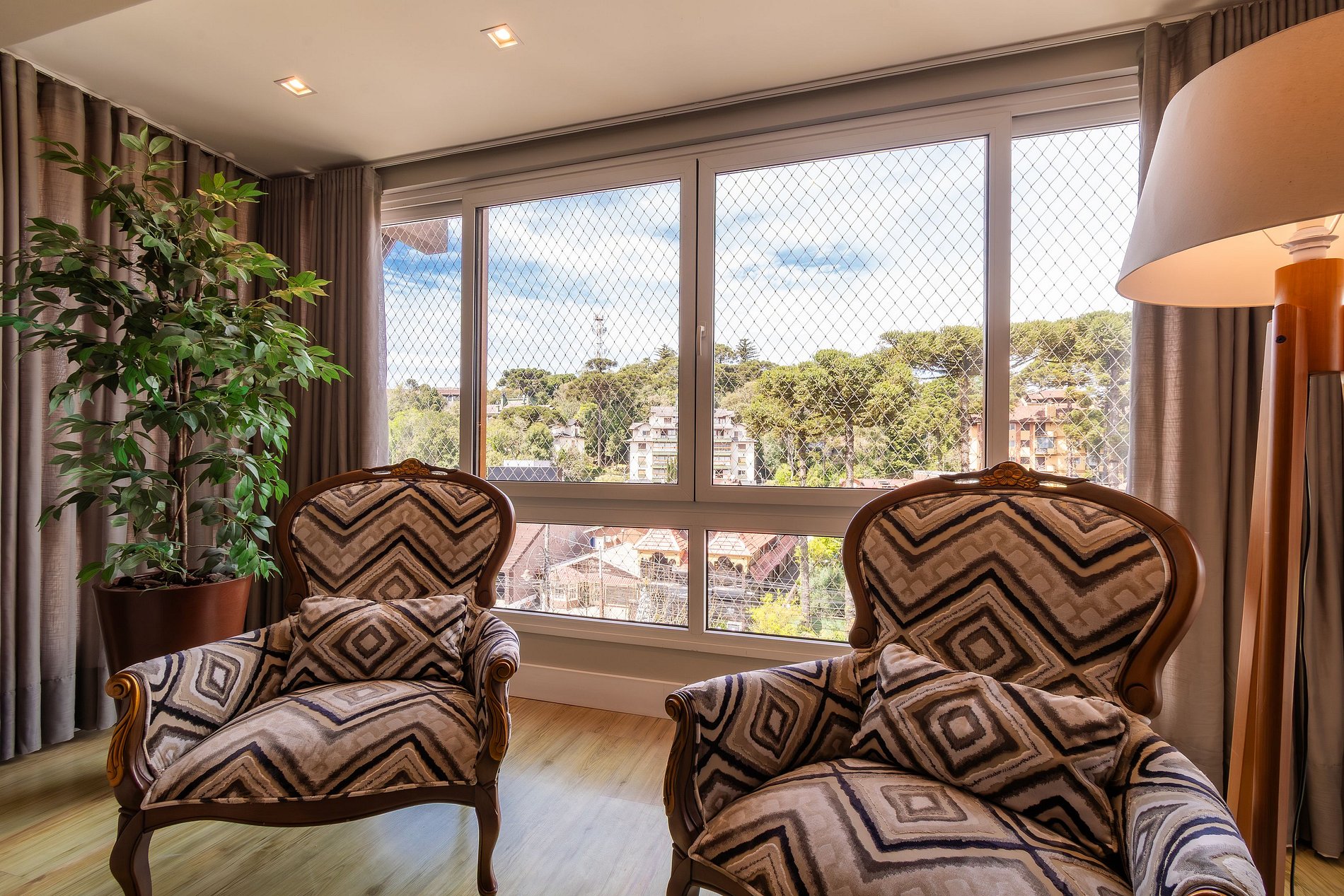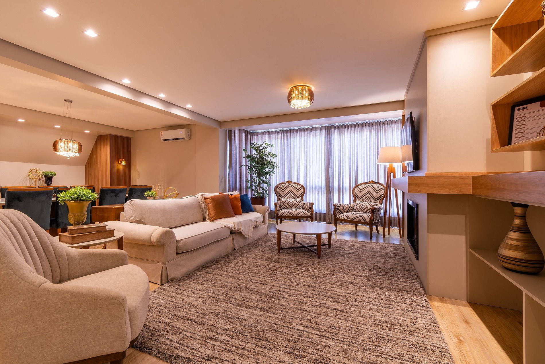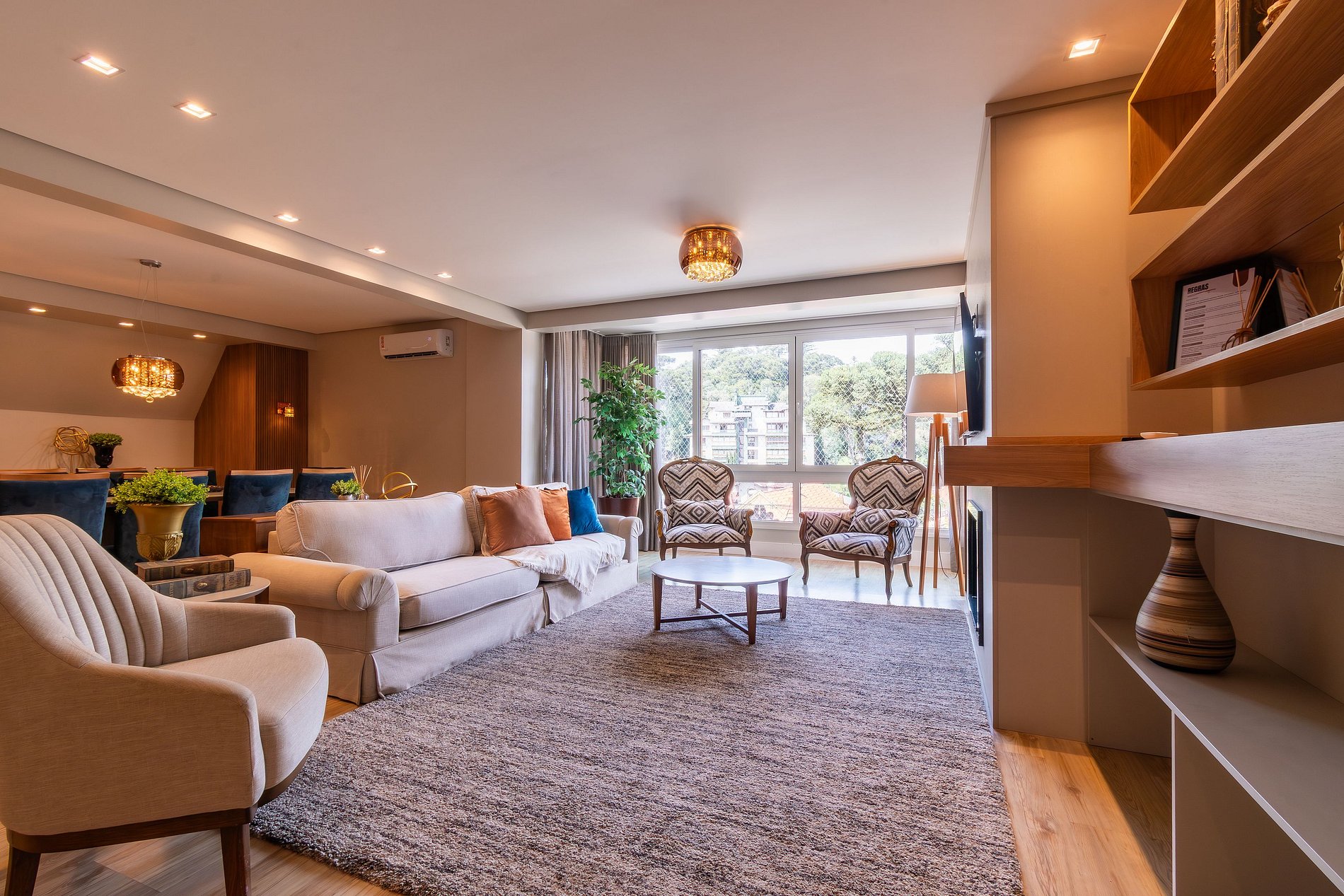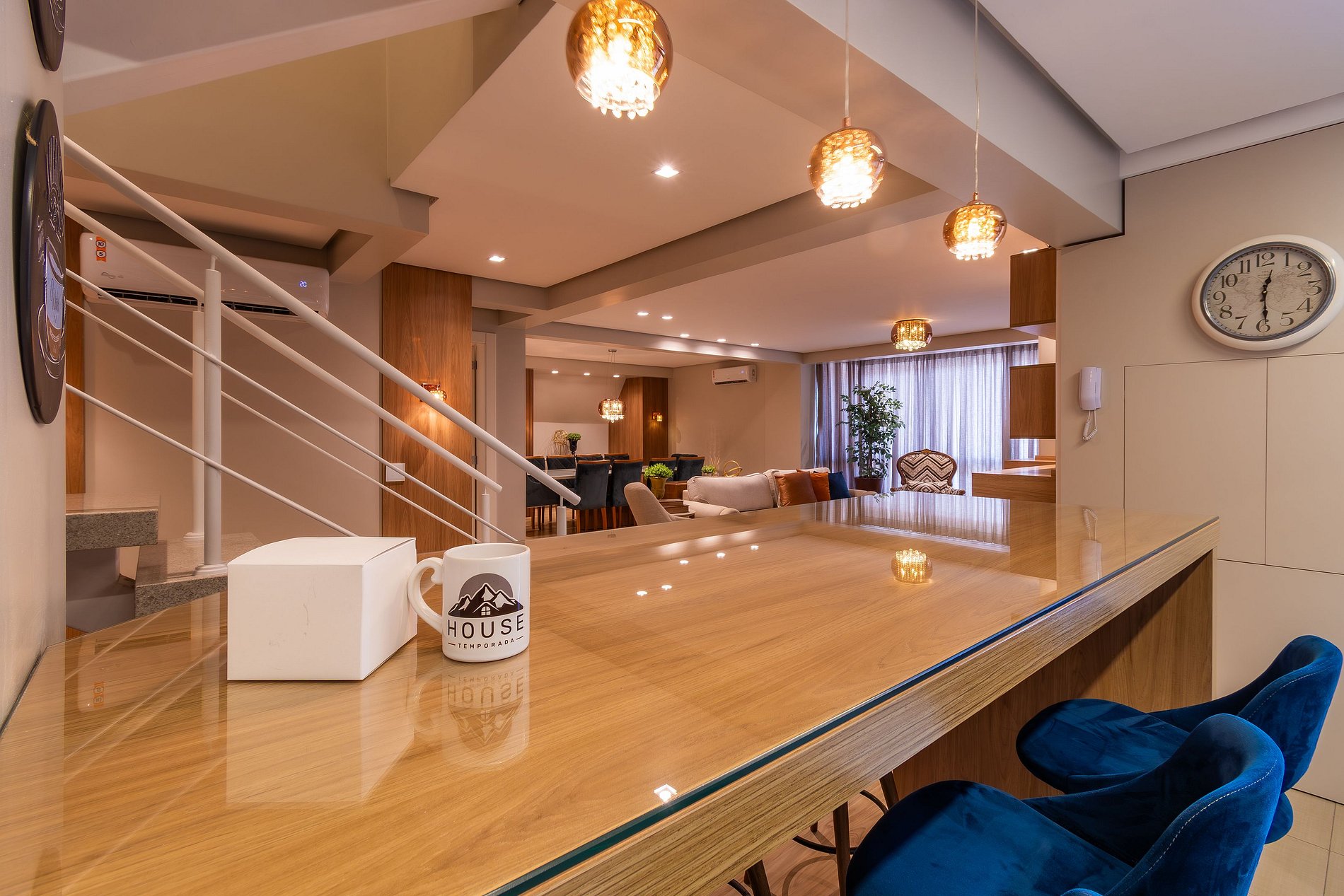 Exclusiva cobertura duplex de luxo a 300 m da Rua Coberta. São 4 dorms (3 suítes), 4 banheiros, hidromassagem, lareira, churrasqueira interna, cozinha completa, 5 Smart TVs com canais, Netflix e YouTube, ar-condicionado, aquecimento e Wi-Fi veloz. Acomoda até 12 hóspedes com conforto. Inclui roupas de cama e banho.