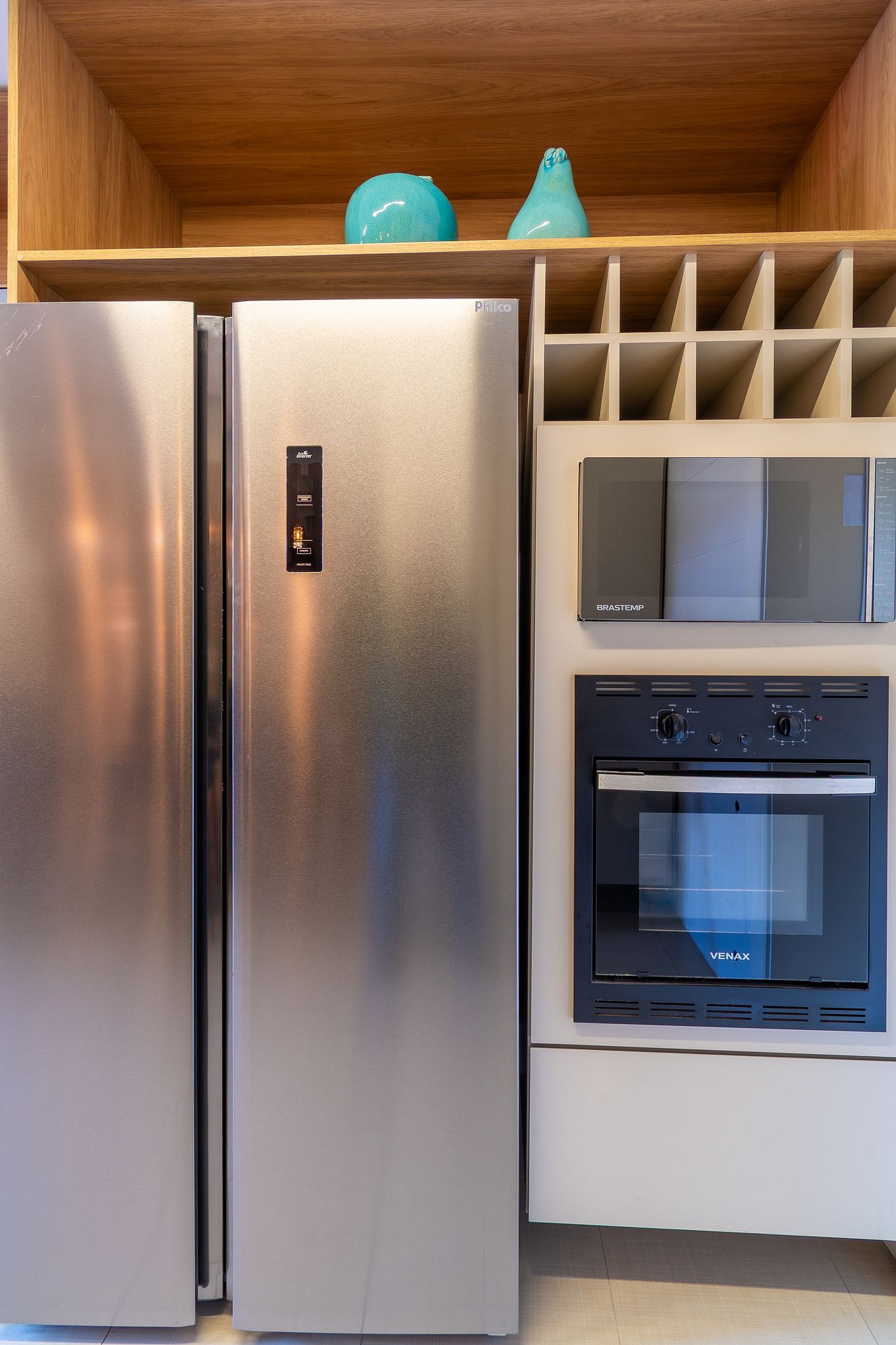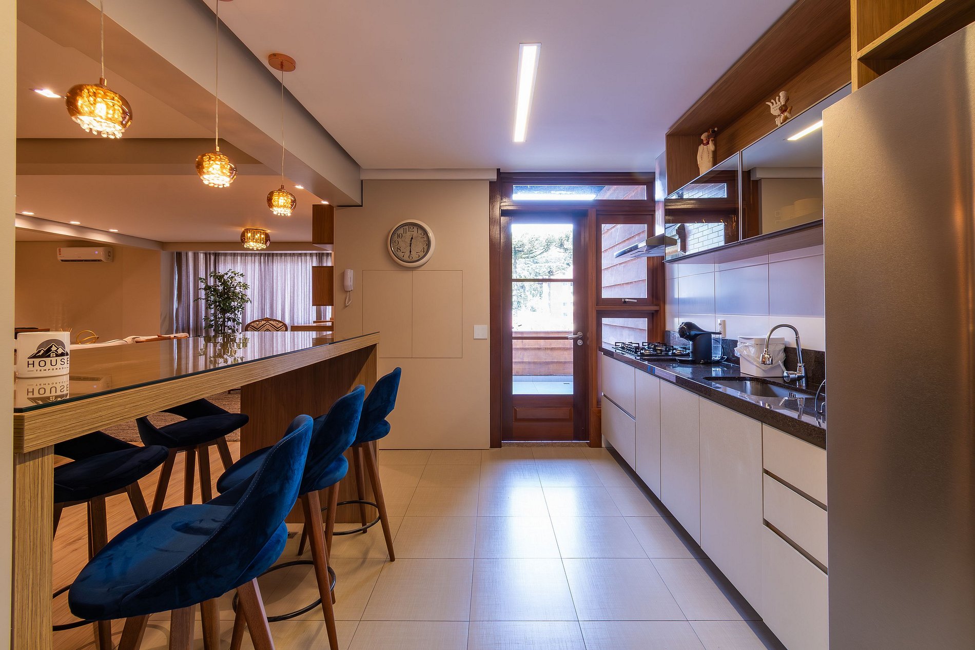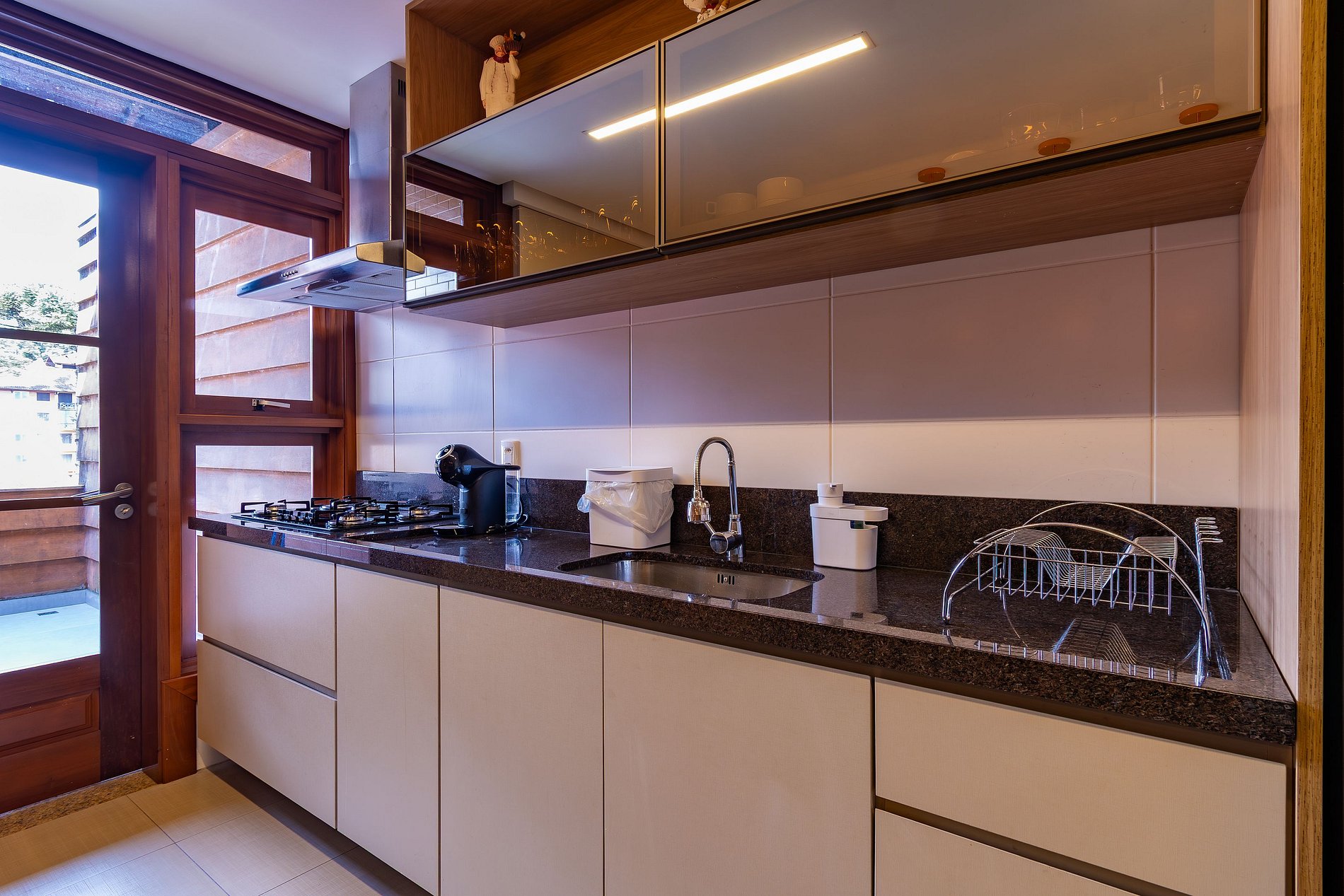 A cozinha é completamente equipada, perfeita para refeições rápidas ou completas. Inclui geladeira, fogão embutido, micro-ondas, cafeteira, sanduicheira, chaleira e todos os utensílios necessários, como copos, facas, taças, talheres, panelas, frigideiras, entre outros.